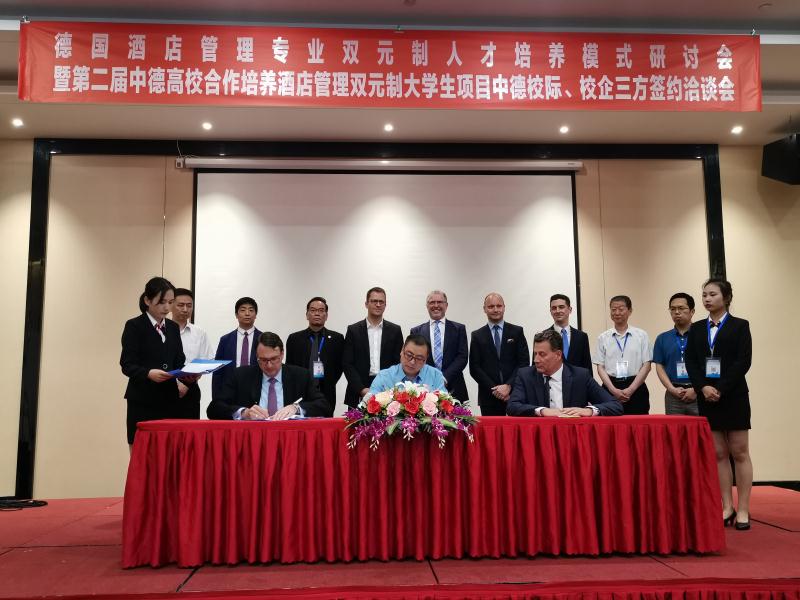主动走向世界舞台,开展国际友好往来。学院广泛开展与国外高等学校、科研院所、教育机构的实质性交流,积极主动走向国际舞台。先后与韩国、马来西亚、泰国、新加坡、英国、加拿大、德国、西班牙、美国等多个国家的多所高校进行了境外本科教育、寒暑假游学和教职工学历提升等项目的交流合作。2019年4月以来,学院先后与韩国延世大学、牧园大学、英国的罗汉普顿大学、马来西亚斯特亚大学、伯乐大学等学校签署了MOU合作协议,明确了学生出国留学的项目手续、优惠条件、教师学历晋升等具体细则。2019年5月,与德国IST管理应用技术大学、德国酒店行业协会签订了三方合作培养酒店管理双元制大学生项目协议,开辟了学生进入IST与酒店行业协会的会员酒店联合培养的双元制专业学习的通道。2019年6月,与东方宇新(北京)国际教育科技有限公司签署了《中欧/中澳/中新产教融合+高水平应用型高校建设项目合作协议》。初步同意成立国际教育服务中心,联合培养不少于2个专业、每个专业不低于100人的国际化项目,并连续进行五届学生的培养。